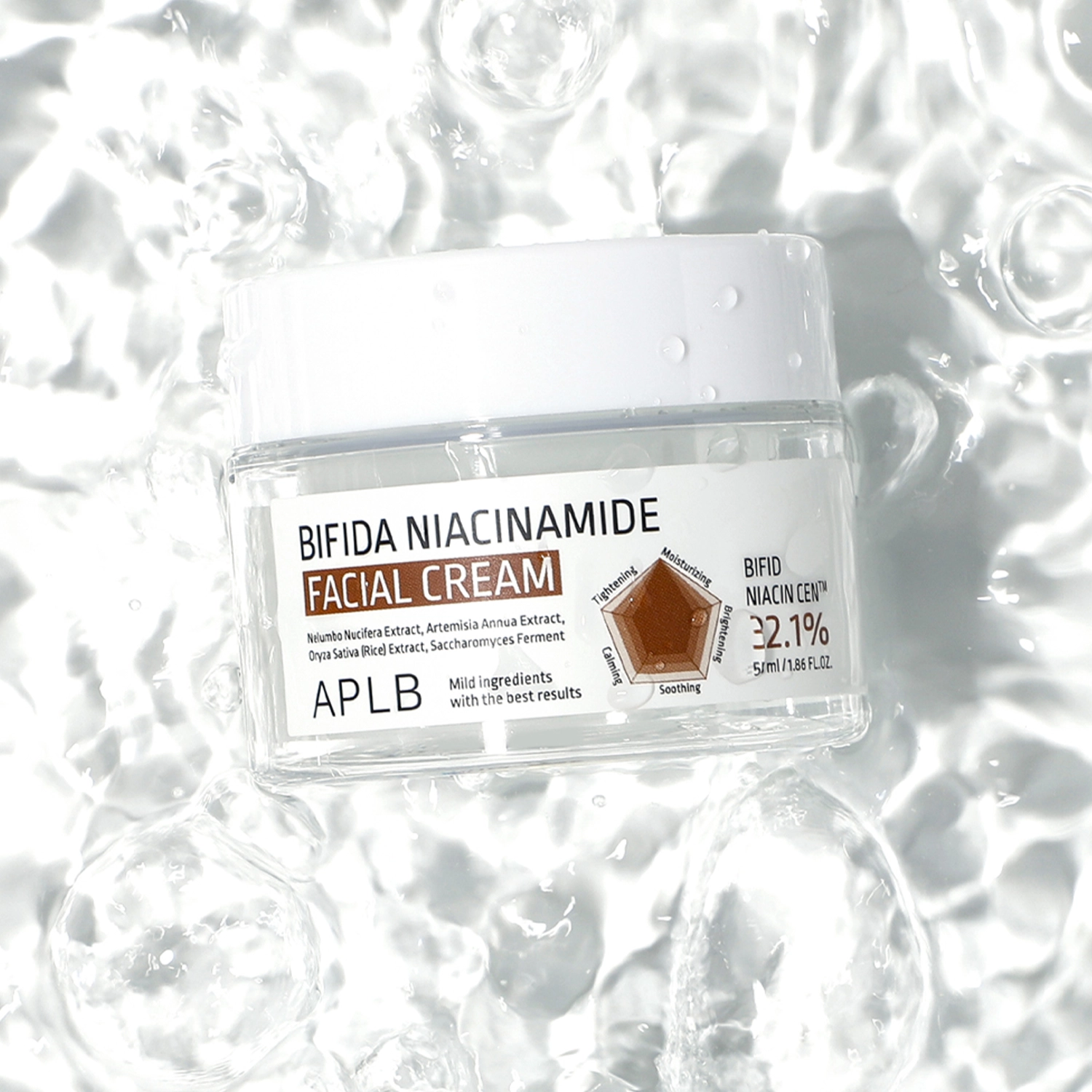 APLB - Bifida Niacinamide Facial Cream - cremă destinată îngrijirii zilnice a feței. Apa din frunze de Centella Asiatica inclusă în compoziția produsului hidratează intens pielea, calmează iritațiile și reduce inflamațiile. Niacinamida prezentă în formulă reglează secreția de sebum a glandelor sebacee și reduce vizibilitatea porilor dilatați, lăsând pielea mai netedă. De asemenea, lizatul de bacterii Bifida ajută la restabilirea echilibrului microbiomului pielii și accelerează procesul de regenerare. Formula cremei a fost îmbogățită cu hialuronat de sodiu și trehaloză, ingrediente care sporesc proprietățile de hidratare ale produsului și conferă pielii o senzație de catifelare. Crema este un complement ideal în rutina zilnică de îngrijire a pielii grase și mixte, fiind recomandată în special persoanelor cu pori vizibil dilatați.