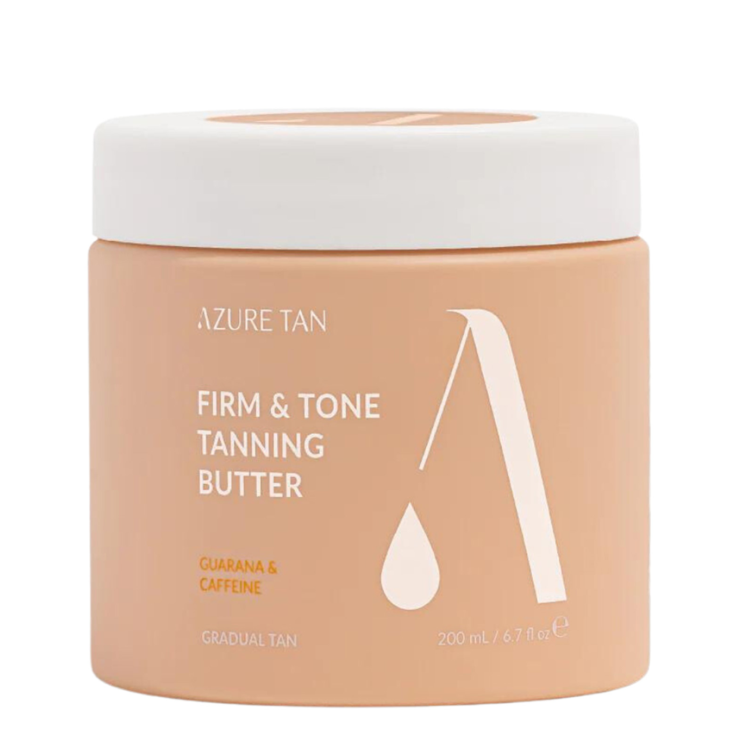 Azure Tan - Firm & Tone Tanning Butter - Unt corporal cu efect gradual de bronzare, care hrănește pielea și îi conferă o nuanță frumoasă, bronzată. Produsul conține DHA natural, responsabil pentru efectul autobronzant. Untul de shea netezește intens, hidratează și lasă pielea catifelată. Guarana și cofeina stimulează microcirculația, îmbunătățesc fermitatea și elasticitatea pielii, reducând umflăturile. Produsul are un parfum plăcut de mango tropical. Poate fi folosit singur sau pentru menținerea bronzului. Formula este vegană.