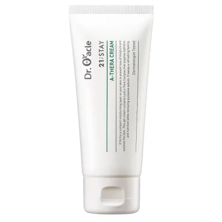 Dr.Oracle – A-Thera Cream este o cremă ușoară pentru ten acneic. Formula sa lejeră conține ingrediente hidratante, calmante și care accelerează regenerarea pielii. Datorită conținutului ridicat de apă și extract de frunze de ceai verde, crema are o acțiune antioxidantă intensă și calmantă, ajută la reducerea iritațiilor și a roșeții pielii. Compoziția este îmbogățită și cu niacinamidă (vitamina B3), care reglează secreția de sebum, reduce vizibilitatea porilor și susține bariera de protecție a pielii. Prezența extractului de centella asiatica și a pantenolului întărește proprietățile antiinflamatorii ale produsului și ajută pielea să se regenereze mai rapid.