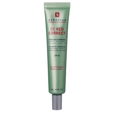 Erborian – CC Red Correct – cremă CC pentru neutralizarea roșeții feței, datorită pigmenților verzi adăugați și ingredientelor active. Oferă un ten mai luminos, estompează micile imperfecțiuni, uniformizează nuanța pielii și asigură protecție suplimentară împotriva radiațiilor solare, datorită filtrelor mixte. Consistența sa lejeră se aplică ușor atât cu degetele, cât și cu burețelul. Datorită conținutului de extract de centella asiatica, produsul calmează eficient pielea și reduce roșeața. Crema CC este o alegere excelentă pentru un machiaj zilnic cu efect de înfrumusețare.