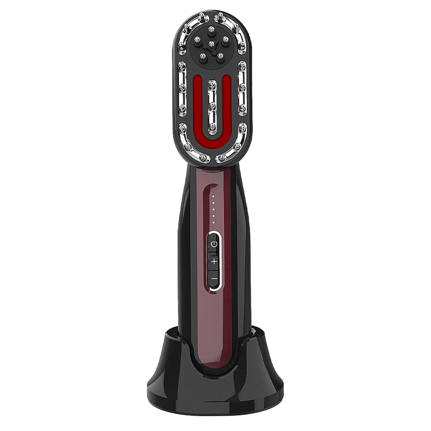 1. Îngrijirea părului și a scalpului: Pentru a porni dispozitivul, apasă și menține apăsat butonul de pornire până când simți vibrațiile. Dispozitivul va porni automat în Modul 1, adică la cel mai scăzut nivel de putere. Schimbarea modului de funcționare se face printr-o apăsare scurtă a butonului de pornire. Pentru a opri dispozitivul, menține din nou apăsat butonul până la apariția vibrațiilor. Butonul „+” permite creșterea treptată a puterii (de la nivelul 1 la 5), iar butonul „–” scăderea acesteia (de la nivelul 5 la 1). Înainte de tratament, asigură-te că scalpul este curat și uscat, iar părul bine descurcat. În timpul utilizării capului tip perie, deplasează dinții acesteia lent pe scalp, efectuând mișcări delicate în zigzag. Începe tratamentul de la cel mai scăzut nivel de putere și crește-l treptat, ajustând intensitatea în funcție de confort. Asigură-te că toți dinții metalici ai periei sunt în contact constant cu scalpul, evitând însă presiunea excesivă care ar putea provoca iritații sau leziuni. Condu peria vertical, de-a lungul scalpului, aplicând o presiune moderată. Tratamentul scalpului este recomandat o dată la 2–3 zile, iar durata nu trebuie să depășească 5 minute. La fiecare utilizare, masează toate zonele scalpului pentru a permite acțiunea eficientă a luminii roșii și albastre, care ajunge uniform pe întreaga suprafață a pielii. La prima utilizare se recomandă începerea cu cel mai scăzut mod de funcționare și ajustarea treptată a setărilor.