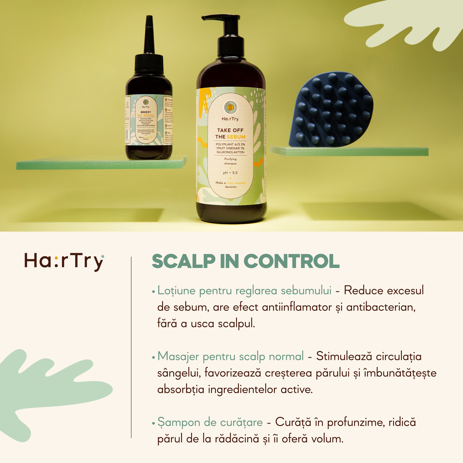 HairTry – Set „Scalp In Control” – un set creat pentru scalpul cu exces de sebum și pierderea rapidă a prospețimii. Șamponul Take Off The Sebum oferă o curățare temeinică, iar loțiunea Breezy Not Greasy normalizează activitatea glandelor sebacee. Setul include și un masajer din silicon de la Cosibella Accessories, care facilitează aplicarea loțiunii, dar este util și la spălare, ca accesoriu pentru masajul scalpului. Ideal pentru persoanele cu păr lipsit de volum, care își doresc prospețime și lejeritate zi de zi.