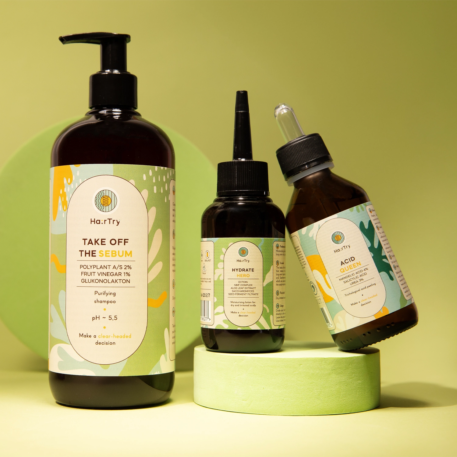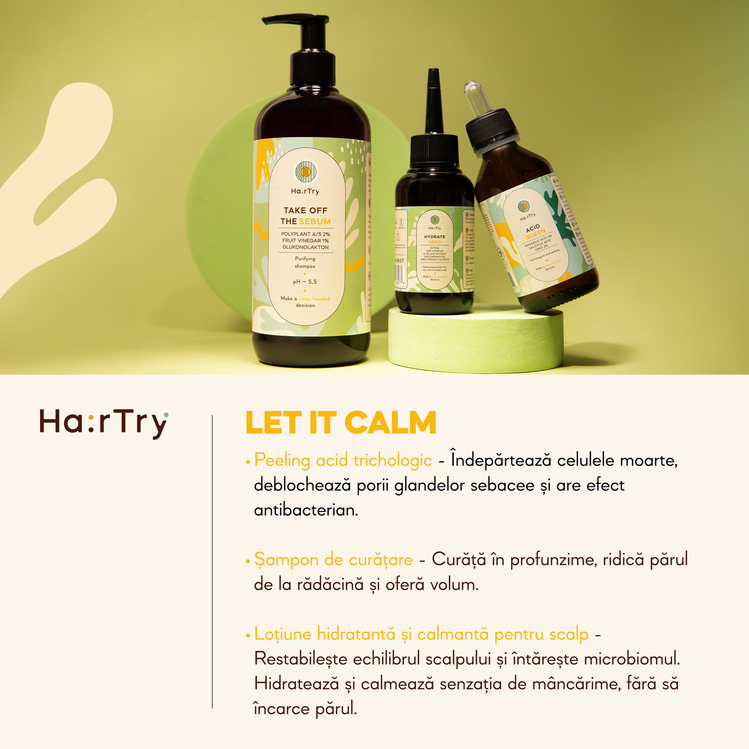 HairTry – Set „Let It Calm” – un set creat pentru scalpul cu exces de sebum, pierderea rapidă a prospețimii, microbiom dezechilibrat sau tendință la iritații. Șamponul Take Off The Sebum oferă curățare temeinică, peelingul Acid Queen îndepărtează celulele moarte și deblochează foliculii, iar loțiunea Hydrate Hero hidratează și calmează scalpul. Setul este ideal pentru părul lipsit de volum și scalpul cu mâncărimi, oferind prospețime și confort zi de zi.