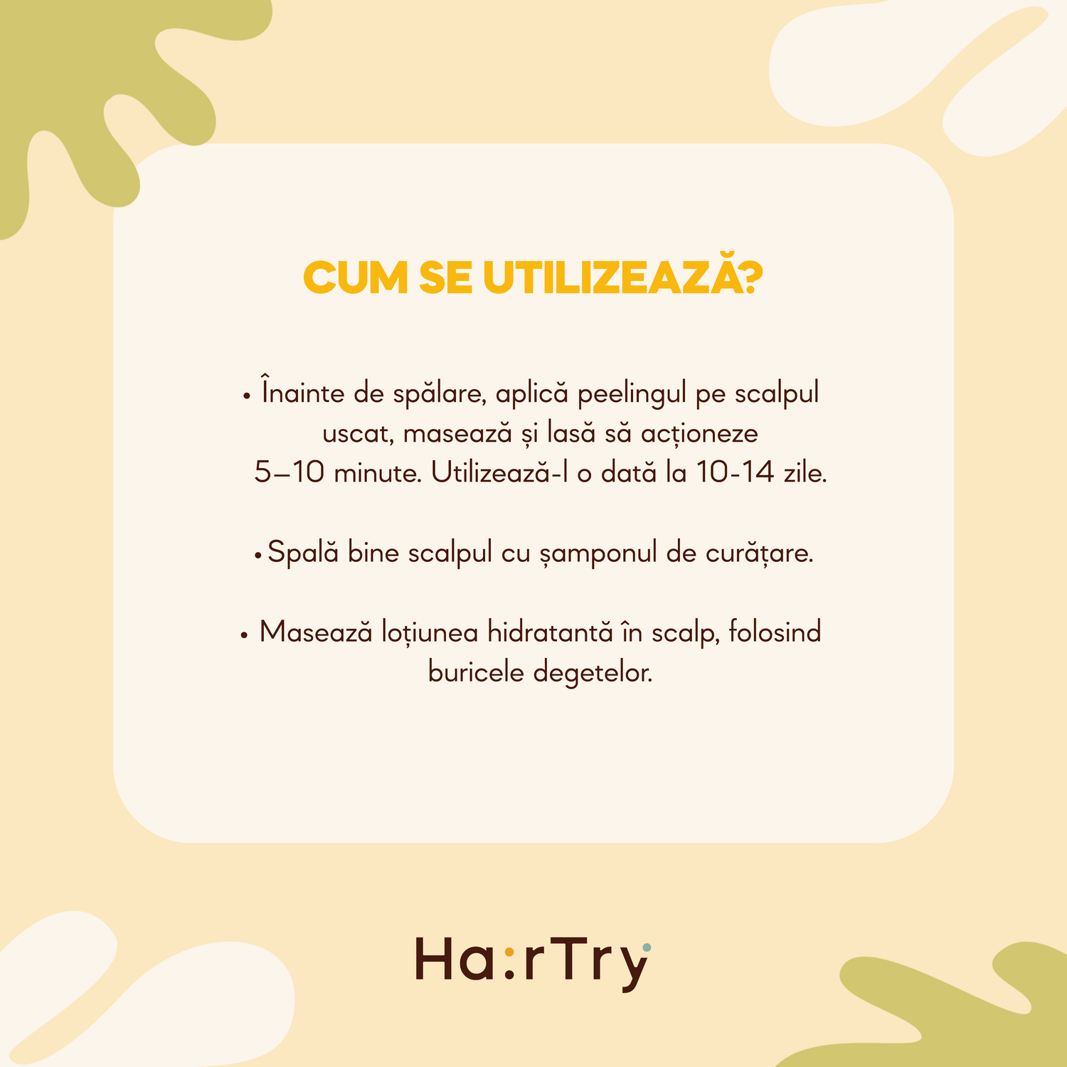 - Acid Queen: Înainte de spălare, aplicați o cantitate mică pe scalpul uscat, secțiune cu secțiune. Masați delicat. Lăsați să acționeze 5–10 minute, apoi spălați de două ori cu șampon. Folosiți la fiecare 10–14 zile, în funcție de necesități. Nu este potrivit pentru femeile însărcinate sau care alăptează.