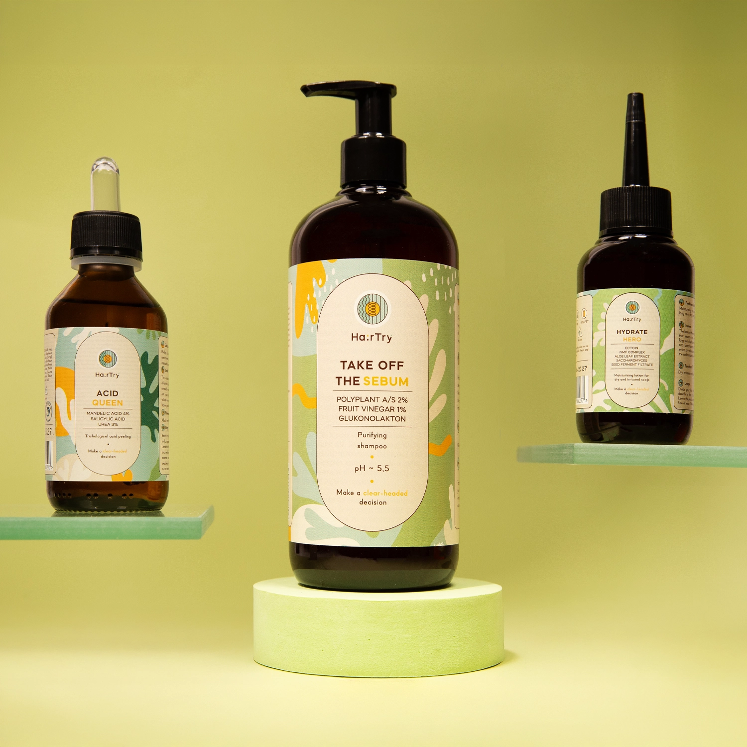 - Take Off The Sebum – șampon cu efect de curățare și prelungire a prospețimii. Creat pentru scalp gras și păr fără volum. Formula gel se transformă ușor într-o spumă plăcută, iar consistența optimă împiedică scurgerea printre degete. Surfactanții combinați (anioni, amfoteri și neionici) oferă curățare eficientă fără a provoca iritații sau uscăciune. Conține ingrediente active precum 2% POLYPLANT A/S, 1% oțet de fructe și gluconolactonă. Utilizarea regulată ridică părul la rădăcină, oferă volum, iar părul rămâne ușor și aerat. Are un parfum proaspăt, discret parfumat. Capacitate: 500 ml.