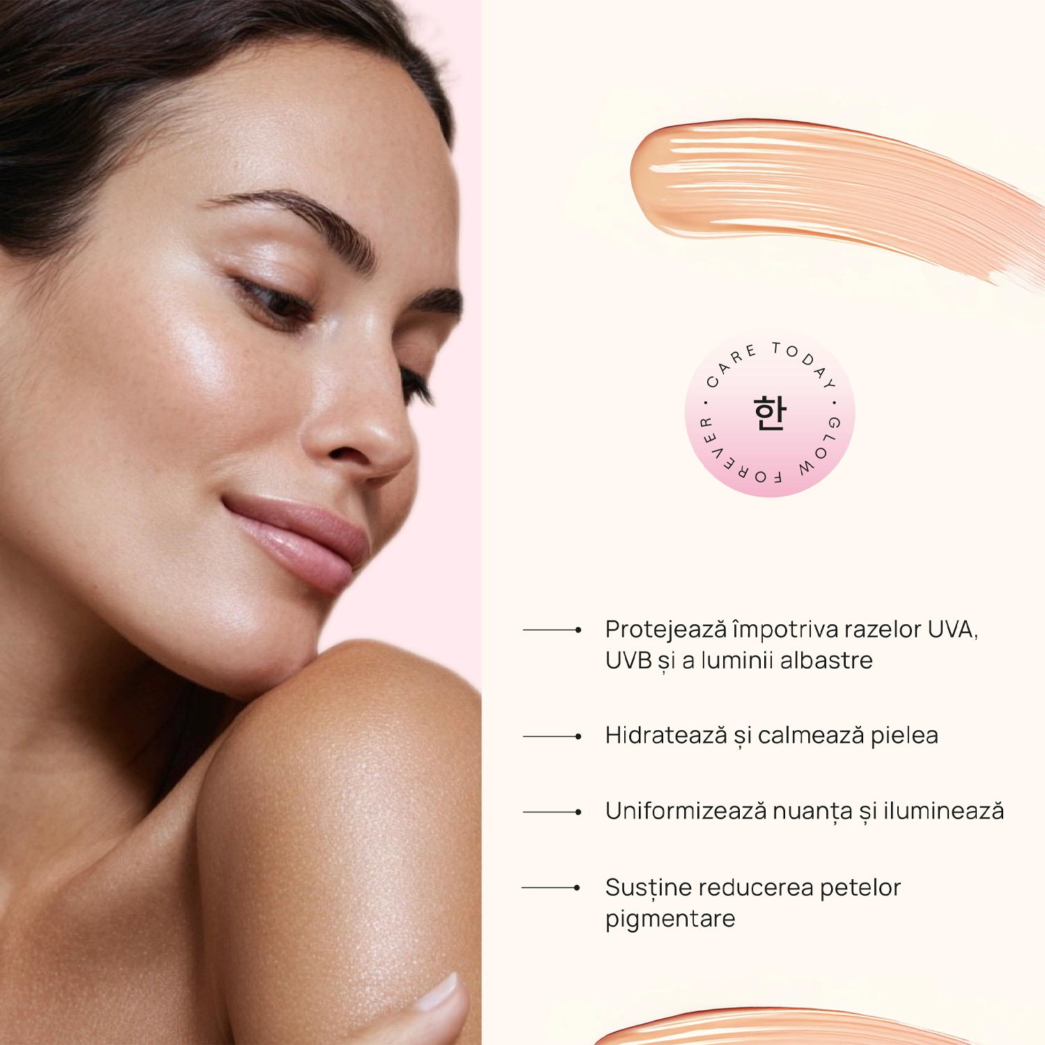 - Cremă tonifiantă cu protecție SPF 50+ într-o nuanță deschisă