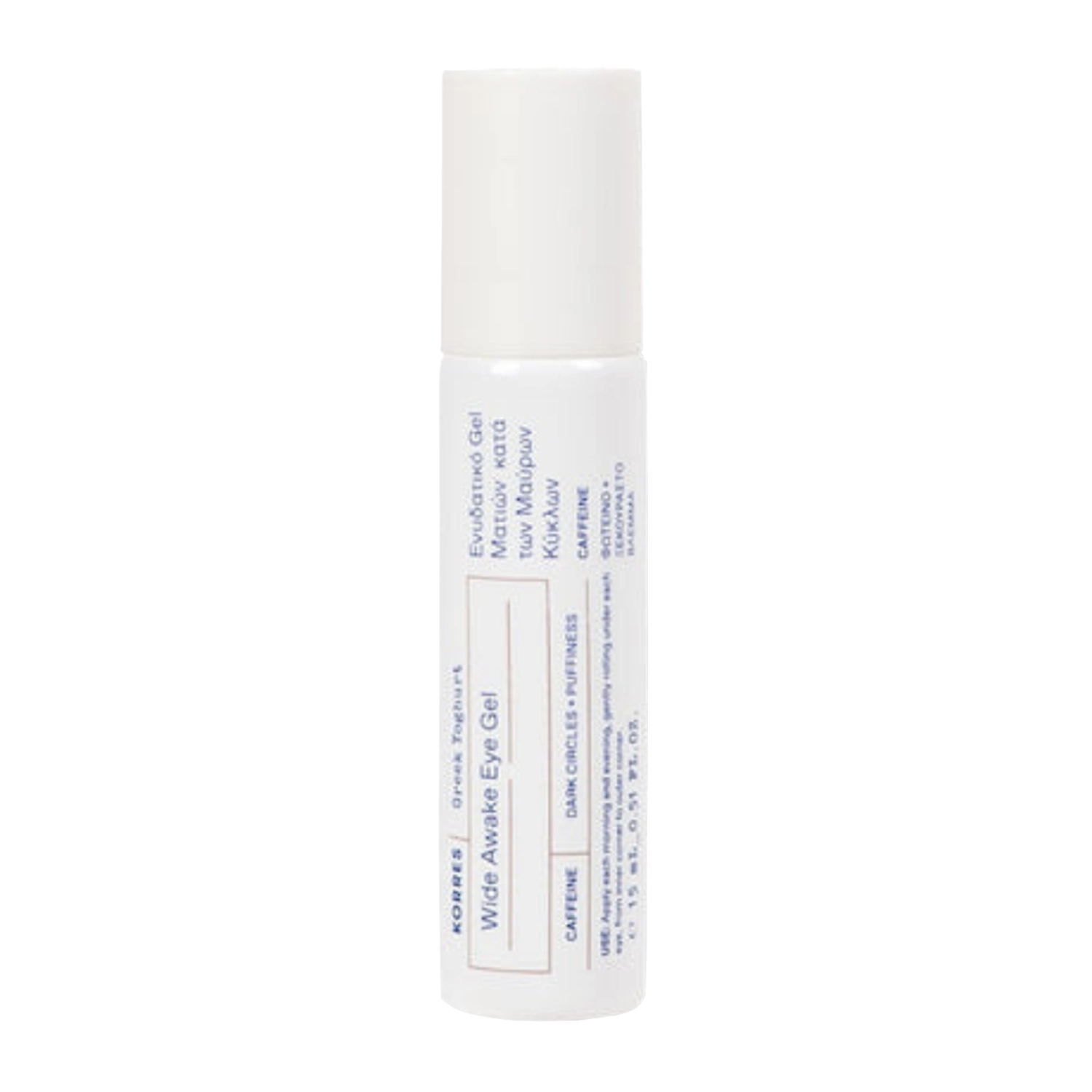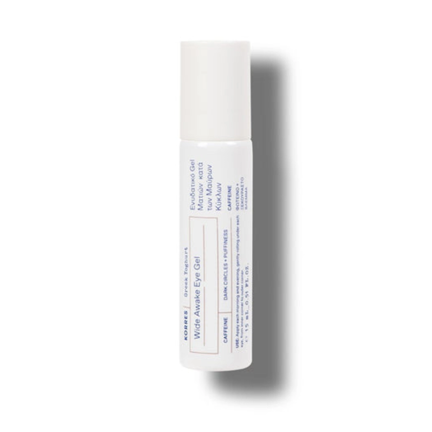 Korres – Greek Yoghurt Wide Awake Eye Gel este o cremă ușoară și răcoritoare pentru zona ochilor, sub formă de roll-on. Formula cu pudră de iaurt nutritivă și cafeină contribuie la reducerea cearcănelor și a umflăturilor din jurul ochilor, redând pielii un aspect mai odihnit. Textura tip gel, îmbogățită cu vitamina C, luminează nuanța neuniformă a pielii și are acțiune antioxidantă. Adaosul de extract din flori de mușețel are efect calmant, liniștitor și antiinflamator, ajutând la reducerea iritațiilor și a roșeții din zona delicată a ochilor. Produsul conține 97% ingrediente de origine naturală. Aplicatorul practic permite realizarea unui masaj relaxant și drenant al pielii din jurul ochilor.