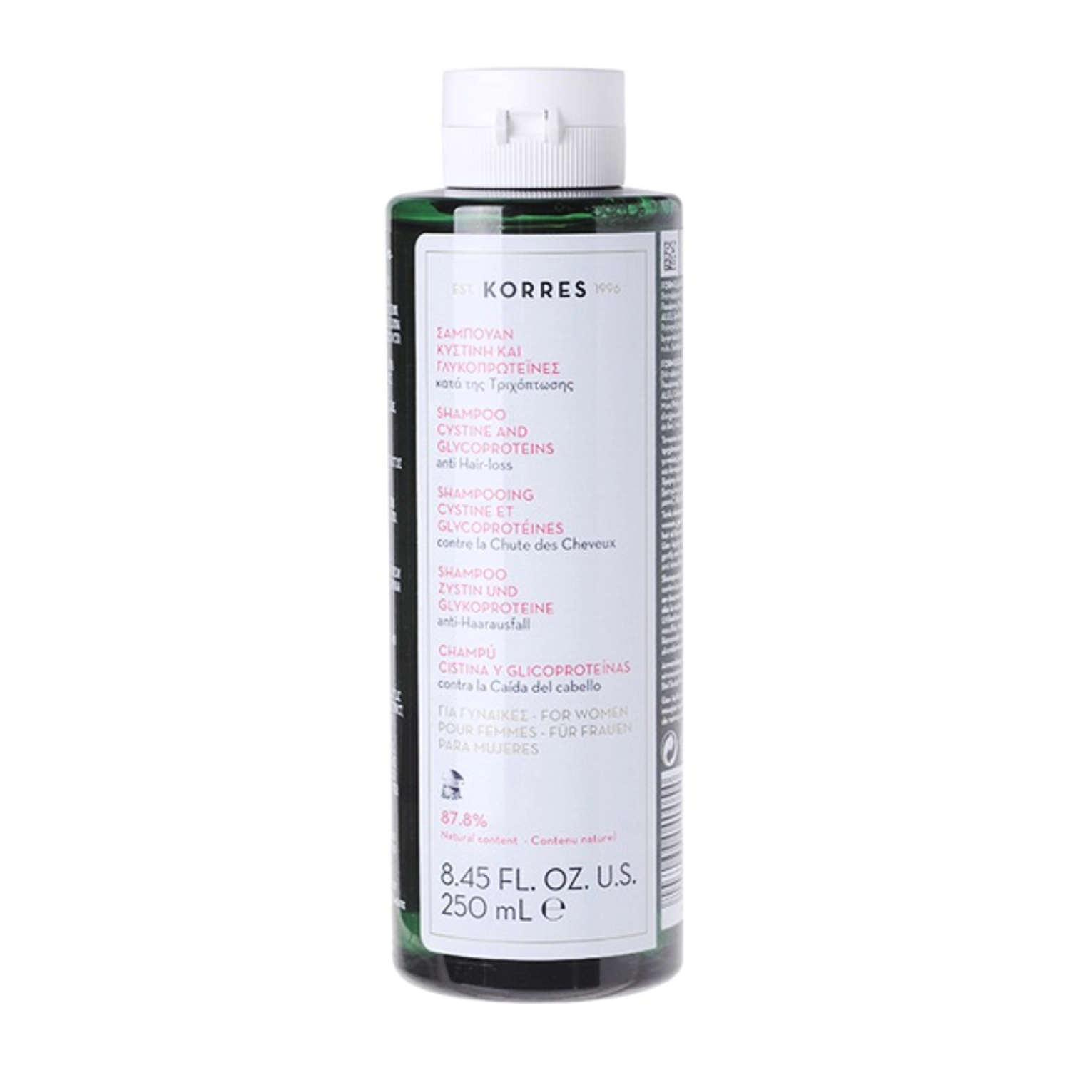 Korres – Shampoo Cystine and Glycoproteins este un șampon creat pentru femeile care se confruntă cu pierderea excesivă a părului. Formula bazată pe cistină hrănește intens și sprijină refacerea keratinei din firul de păr, reducând căderea și sporind densitatea părului. Glicoproteinele acționează atât la nivelul foliculilor, cât și pe lungimea firelor de păr, întârziind procesul de slăbire și cădere. Betaina hidratează și calmează scalpul și părul, prevenind uscarea. Produsul curăță eficient scalpul, prevenind subțierea părului.