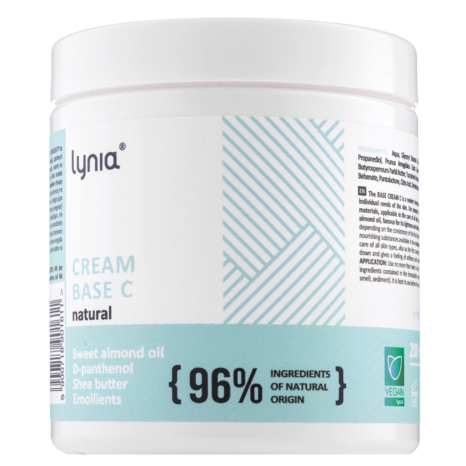 Lynia - Cream Base C Natural - Cremă de bază hidratantă ușoară cu vitaminele B5 și E - Cremă de bază cu textură ușoară, pe bază de materii prime naturale, pentru îngrijirea tuturor tipurilor de piele. Baza a fost îmbogățită cu pantenol și vitamina E. La crearea acesteia a fost folosit uleiul de migdale dulci, renumit pentru lejeritatea și moliciunea sa. Acesta are un efect hidratant, care nu cântărește și conferă o senzație de moliciune și prospețime. Crema de bază poate fi folosită ca un produs cosmetic de sine stătător.