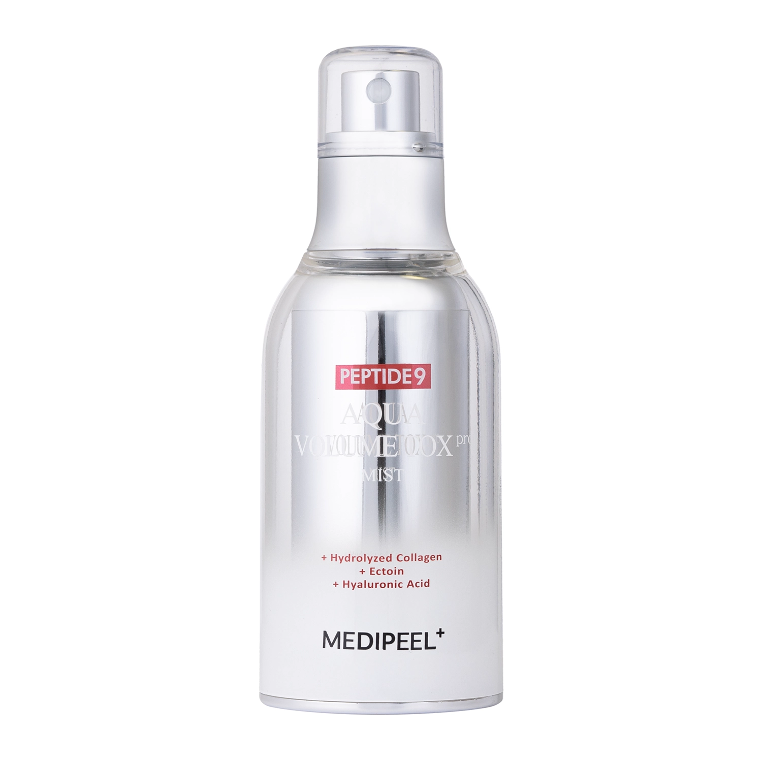 Medi-Peel - Peptide 9 Aqua Volume Tox Mist Pro - spray facial destinat îngrijirii zilnice a feței. Niacinamida conținută în compoziția cosmeticului crește fermitatea și elasticitatea pielii și luminează petele pigmentare. La rândul său, adaosul de adenozină reduce aspectul ridurilor mimice, prin reducerea contracțiilor fibrelor musculare, și extractul din fermentația de soia sprijină bariera naturală de protecție a pielii. Acidul hialuronic și ectoina, pe de altă parte, calmează inflamațiile și îmbunătățesc nivelul de hidratare al pielii. Datorită prezenței hidrolizatului de colagen ,spray facial are un efect de netezire și catifelare. În plus, formula produsului a fost îmbogățită cu un complex de peptide care sporește acțiunea anti-riduri și anti-îmbătrânire.