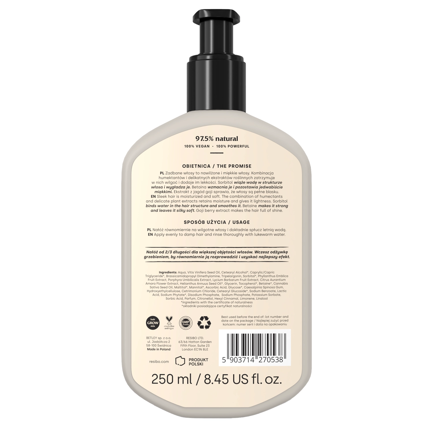 Resibo - Waterlight – Balsam Hidratant – conține o combinație de humectanți și extracte vegetale care oferă părului un plus de hidratare. Sorbitolul reține apa în structura firului și îl netezește, în timp ce glucoza și maltitolul hidratează și previn despicarea vârfurilor. Extractul de amla întărește rădăcinile, reducând căderea părului și stimulând totodată creșterea acestuia. Uleiul de cânepă protejează firele împotriva factorilor externi, le hrănește și le fortifică, iar betaina hidratează și previne electrizarea. Extractul de goji conferă părului un aspect luminos. Balsamul are un parfum proaspăt, citric. Formula este vegană și 97,5% naturală.