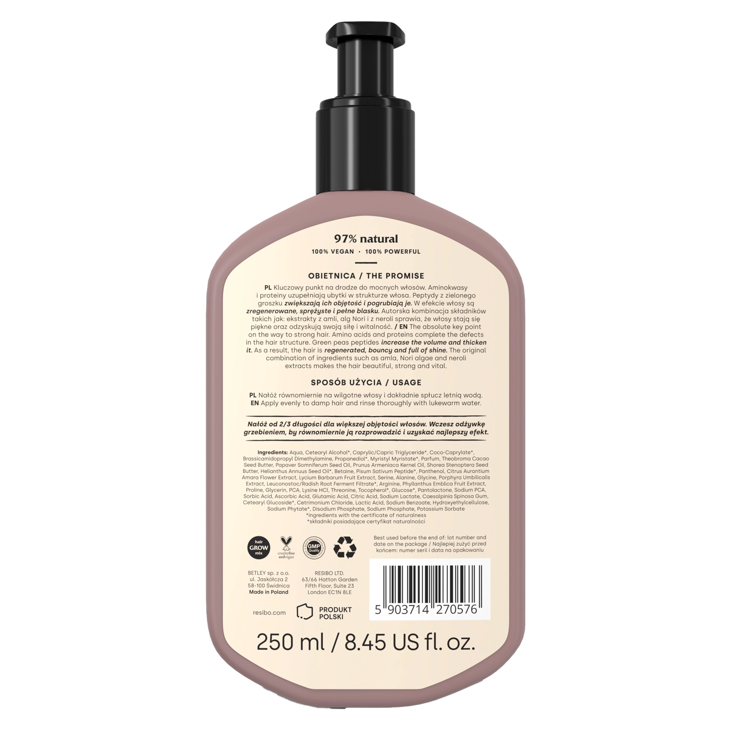 Resibo – Hair Recharger – Balsam Regenerant – conține ingrediente care fortifică firul de păr și îi redau strălucirea și elasticitatea. Complexul de aminoacizi prezent în formulă completează golurile din structura firului și îl netezește, contribuind la regenerare. Pantenolul sigilează cuticulele, hidratează și întărește părul, în timp ce betaina menține hidratarea și reduce electrizarea. Peptidele din mazăre verde sprijină procesele de regenerare, îngroașă firele și oferă volum. Extractul de amla întărește rădăcinile și reduce căderea părului, stimulând totodată creșterea acestuia. Uleiul din semințe de mac formează pe suprafața firelor un film protector cu rol regenerator, nutritiv și netezitor, conferind un plus de strălucire.