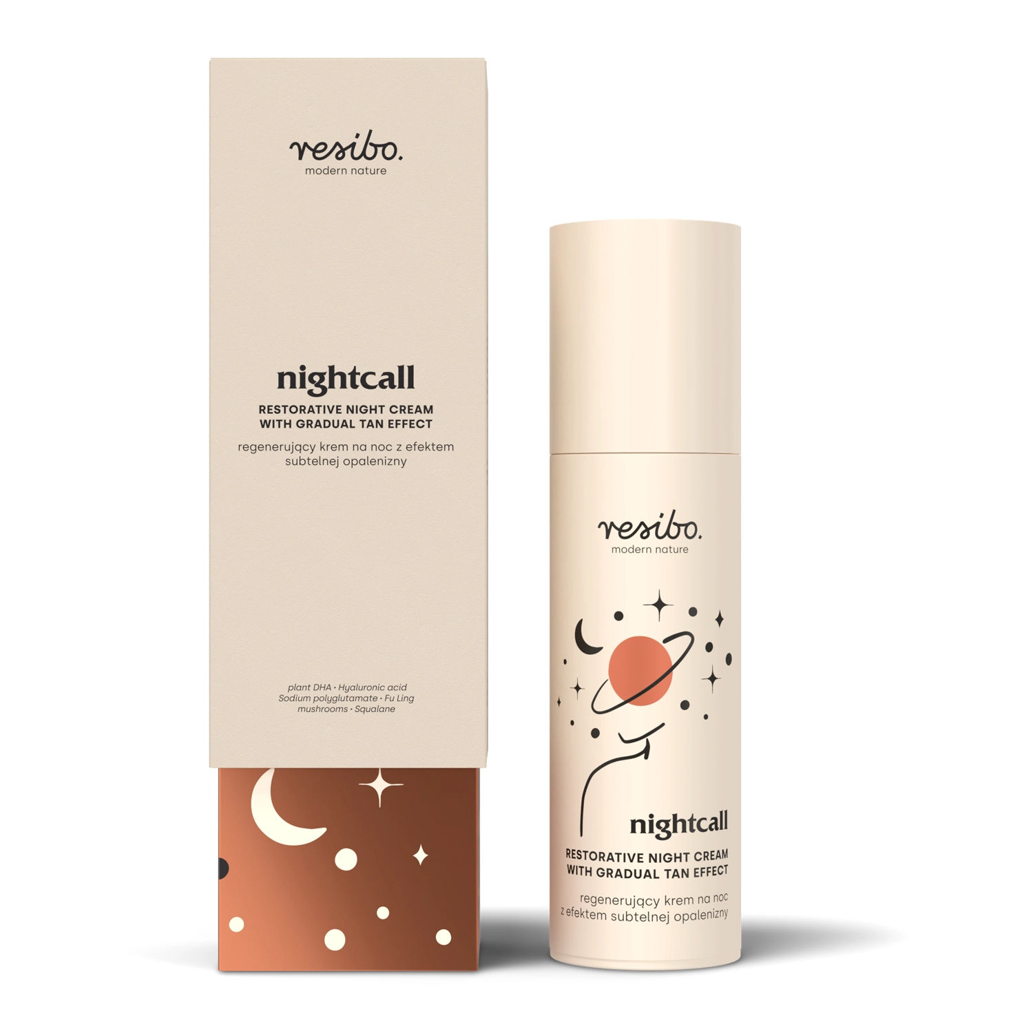 Resibo – Nightcall – cremă regenerantă de noapte cu efect de bronzare naturală oferă pielii un ton subtil bronzat datorită DHA-ului de origine vegetală. Ingredientul Gladback, o fracție de polizaharide din ciupercile Fu Ling, are acțiune anti-îmbătrânire, îmbunătățește densitatea pielii și reduce vizibilitatea ridurilor. Acidul hialuronic menține hidratarea optimă, în timp ce squalanul și uleiurile vegetale, inclusiv uleiul de susan, oferă protecție antioxidantă și întăresc bariera hidrolipidică. Formula este necomedogenă, astfel încât nu provoacă imperfecțiuni. Crema este potrivită pentru toate tipurile de piele, inclusiv pentru cea cu primele semne de îmbătrânire. Produs vegan și de origine naturală.