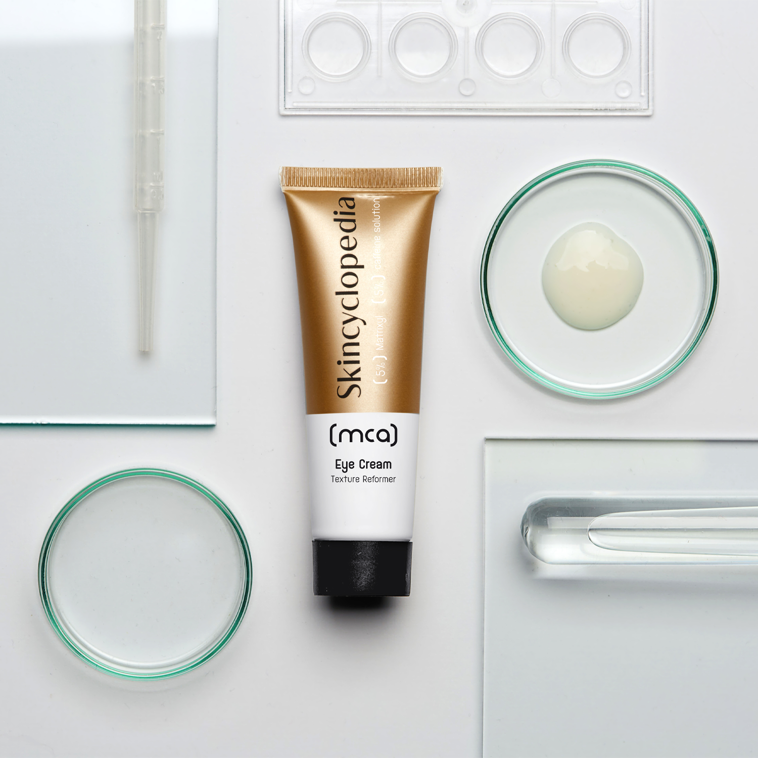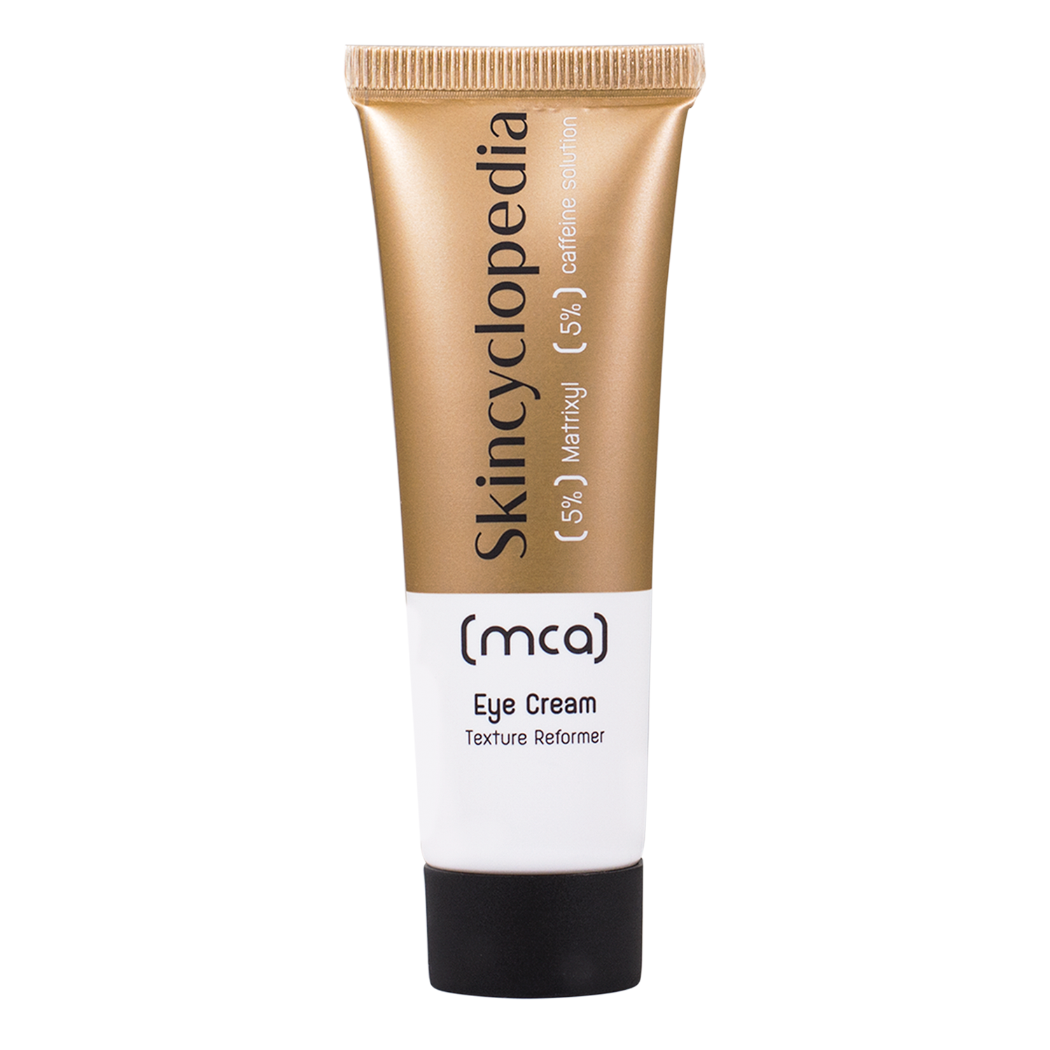 Skincyclopedia - Eye Cream Texture Reformer - o cremă de ochi cu acțiune antirid. Produsul conține 5%Matrixyl 3000® adică uncomplex de două peptide moleculare mici, care pătrund rapid în piele. Acolo ele stimulează producția naturală de colagen, elastină și acid hialuronic, reducând în mod eficient aspectul ridurilor și conferind pielii fermitate și elasticitate. Adaosul de 5% cafeină stimulează microcirculația pentru a reduce cearcănele și cearcănele de sub ochi, în timp ce untul de shea previne pierderea de apă din epidermă, protejând astfel pielea de uscăciune.