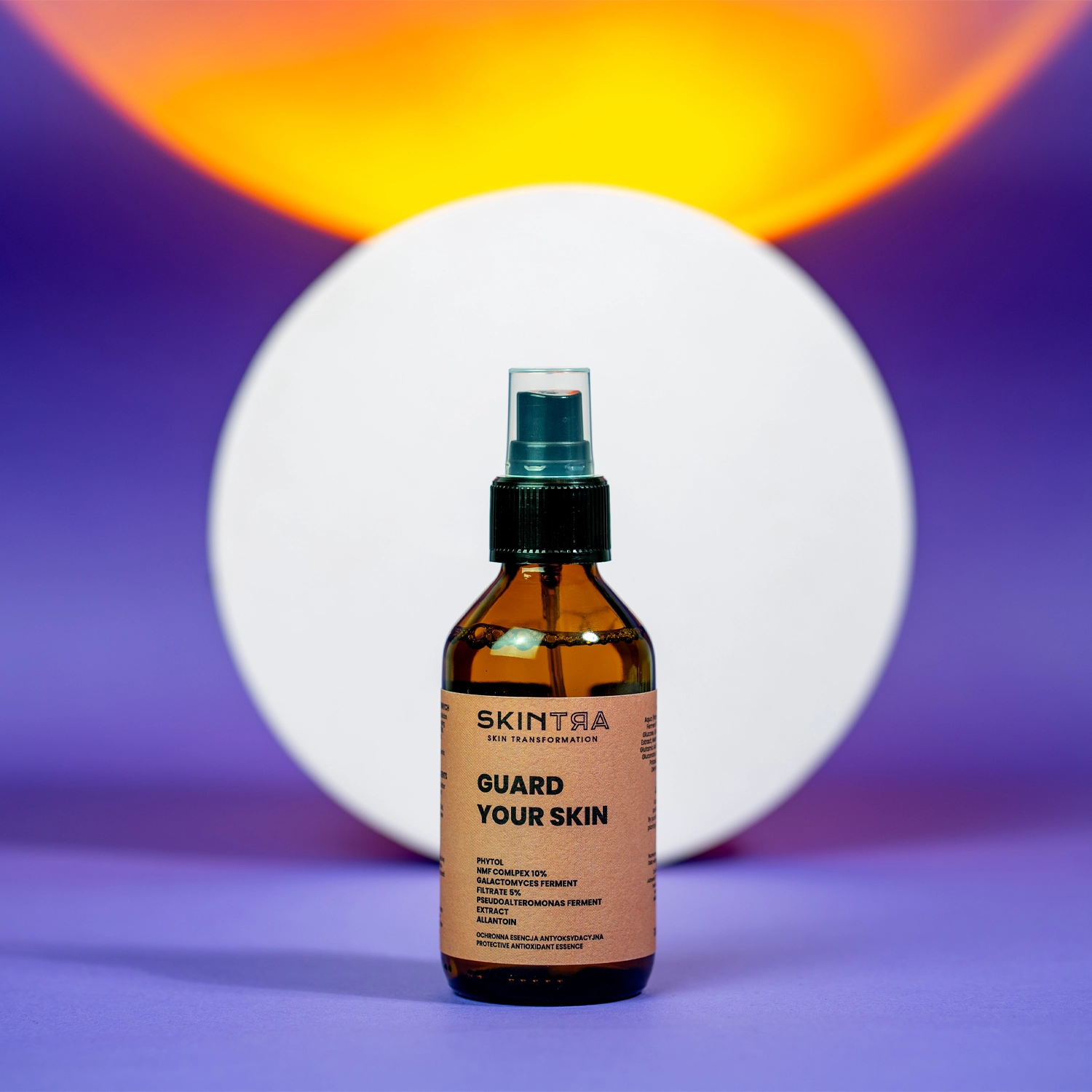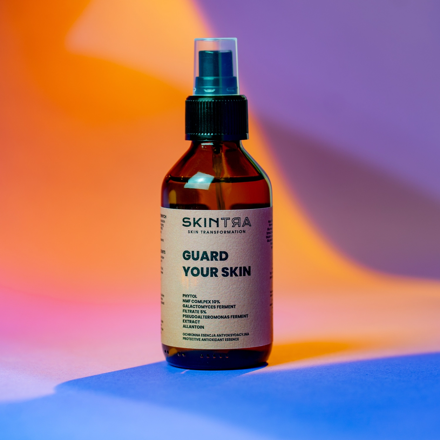 SkinTra - Guard Your Skin - o esență protectoare antioxidantă pentru față, gât și decolteu. Se prezintă sub forma unui spray ușor care lasă un efect de strălucire naturală pe piele. Are un efect anti-îmbătrânire, un efect de hidratare de lungă durată și protejează pielea de factorii de mediu. Conține ingredientul Menthyl PCA, care oferă un efect de răcire relaxant și durează până la 8 ore. MossCellTec™ No. 1 ajută pielea să se adapteze la condiții externe extreme, hidratează și reduce roșeața. Ingredientul marin Arctalis creează o peliculă ușoară la suprafața pielii pentru a asigura o acțiune antipoluare și protecție împotriva luminii albastre. Complexul NMF hidratează în profunzime și calmează iritațiile, în timp ce Galactomyces Ferment Filtrate are un efect antioxidant și anti-îmbătrânire. Esența lasă o senzație plăcută de răcoare și hidratează timp de câteva ore, fiind perfectă pentru zilele călduroase. Este extrem de ușoară și nu face ca tenul să strălucească. Spray-ul poate fi folosit în jurul ochilor, lucru confirmat de un oftalmolog. Formula sa este non-comedogenă - nu provoacă imperfecțiuni. Cosmeticul este vegan.
