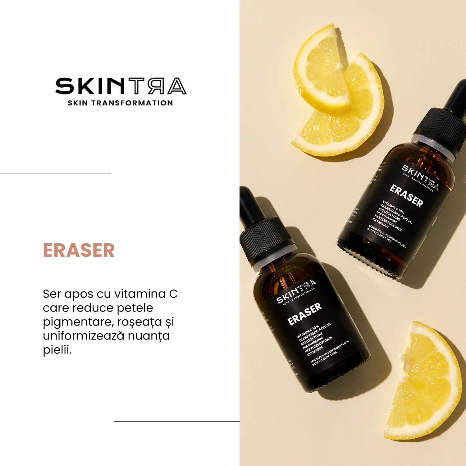 SkinTra - Eraser - ser complet pentru pielea care se luptă cu decolorarea de diferite tipuri - atât roșie (acnee, post-inflamatorie), cât și maro (cauzată de excesul de melanină). Are o consistență apoasă care lasă o peliculă ușor vizibilă pe piele. Serul are un pH de aproximativ 5. Formula este compusă din ingrediente active eficiente care acționează asupra diferitelor mecanisme de decolorare. Serul conține 10% vitamina C etilată, care asigură o acțiune antioxidantă și, de asemenea, luminează pielea prin afectarea sintezei melaninei prin inhibarea activității tirozinazei. Acționând în sinergie cu vitamina C se află 3% acid tranexamic, care susține reducerea roșeață, precum și a decolorării brune, datorită proprietăților sale antiinflamatorii. Niacinamida favorizează, de asemenea, iluminarea pielii prin faptul că are grijă de hidratarea și regenerarea pielii. În plus, aceasta potențează acțiunea hexilresorcinolului, care reduce apariția decolorării roșii și maro. Formula include, de asemenea, azeloglicină, care reglează procesul de exfoliere a pielii, precum și silimarină, care are proprietăți antioxidante puternice. Se recomandă utilizarea zilnică și regulată a produsului, împreună cu protecția solară, pentru a vedea rezultatele după doar câteva săptămâni. Formula sa este vegană și nu este destinată utilizării de către femeile însărcinate.
