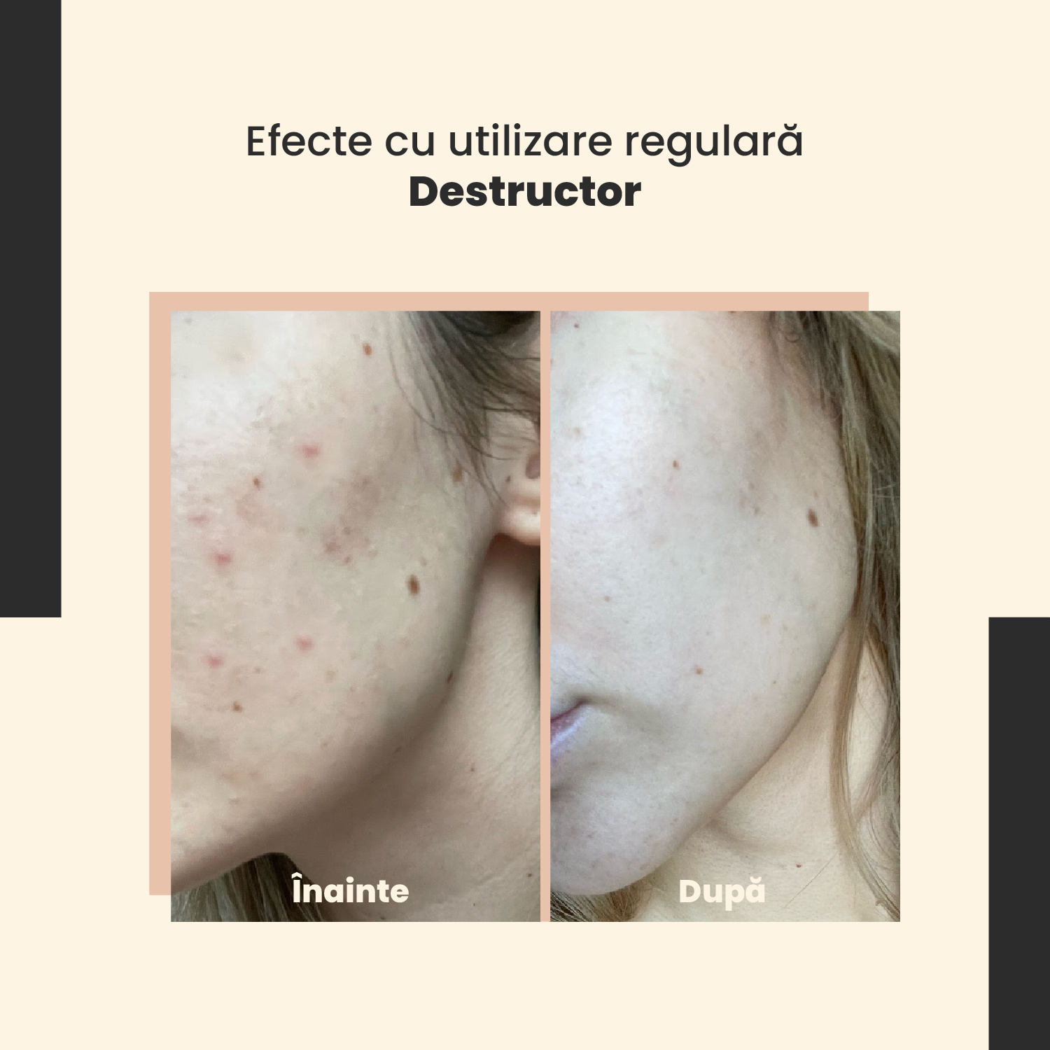 SkinTra - Destructor – peeling cu acizi destinat îngrijirii faciale acasă, pe tot parcursul anului. Formula include, printre altele, acid mandelic, acid kojic, acid tranexamic, azeloglicină și vitamina C. Concentrația ridicată de acizi (24%) asigură o exfoliere intensă, netezire și iluminare a pielii, iar prin inhibarea enzimei tirozinază reduce sinteza melaninei, diminuând astfel riscul apariției de noi pete pigmentare. Dacă pielea ta are un ton neuniform, este ternă, mată, cu puncte negre sau erupții, acesta este produsul MUST HAVE! Poate surprinde prin rezultate – oferă efecte comparabile cu tratamentele profesionale, în confortul casei, chiar după prima utilizare. Produsul nu prezintă potențial fototoxic sau fotoalergic, are pH 2,7, iar formula este vegană. Peelingul Destructor a fost distins cu Perla Pieței Cosmetice 2022 la categoria „Tratament pentru Piele”.