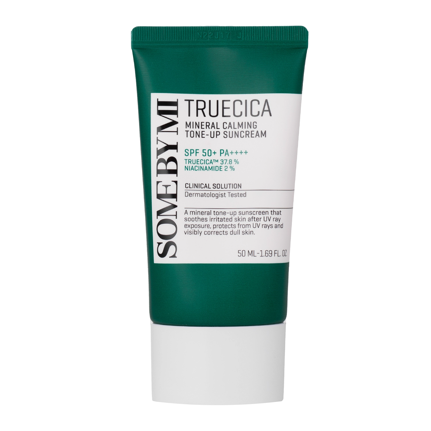 Some By Mi - Truecica Mineral Calming Tone-Up Suncream SPF50+/PA++++ – cremă calmantă de protecție solară, pe bază de filtre mixte și hidrolat de arbore de ceai cu proprietăți antiinflamatorii. Oferă protecție UV cu factor SPF50 și PA++++. Produsul este îmbogățit cu numeroase ingrediente cu efect calmant, precum 2% niacinamidă, extract de frunze de aloe și complexul TRUECICA™ 37,8%. Combinația acestora sprijină eficient regenerarea pielii iritate și aduce confort tenului uscat sau cu roșeață. Crema uniformizează subtil nuanța pielii, nu lasă peliculă albă și oferă un finisaj satinat.