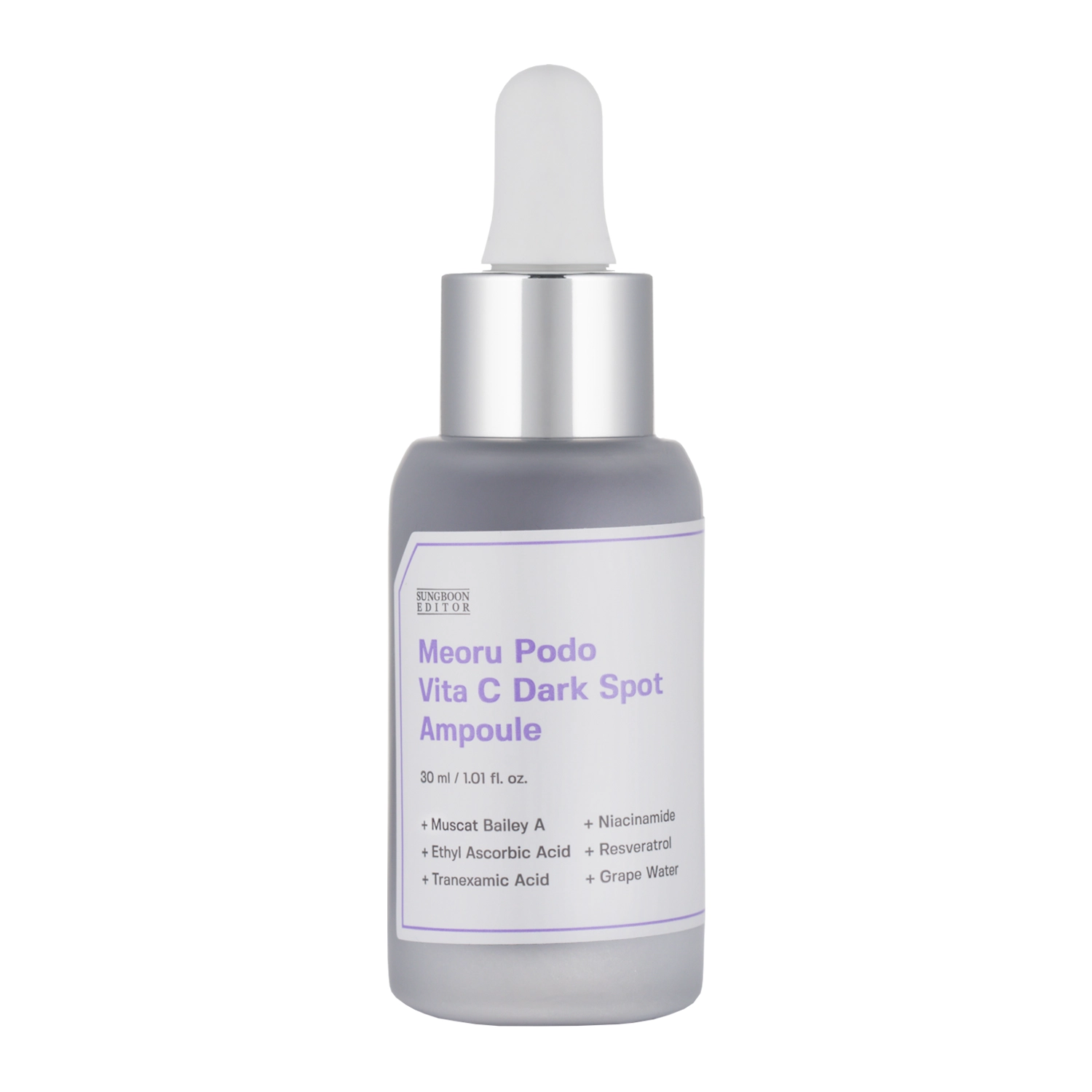 Sungboon Editor - Meoru Podo Vita C Dark Spot Ampoule - fiolă concepută pentru îngrijirea pielii feței afectate de pete pigmentare și ton neuniform, redându-i un aspect uniform și luminos. Apa de struguri din compoziție neutralizează acțiunea nocivă a radicalilor liberi, încetinind astfel procesele de îmbătrânire a pielii, în timp ce colagenul contribuie la reducerea ridurilor. Niacinamida estompează petele pigmentare și întărește bariera hidrolipidică a pielii. Vitamina C calmează inflamațiile, uniformizează nuanța pielii și stimulează sinteza de colagen, oferind un efect anti-aging și redând pielii strălucirea naturală. Formula este completată de acidul tranexamic, care intensifică efectul iluminator al fiolei, susținând eficient uniformizarea tonului pielii.