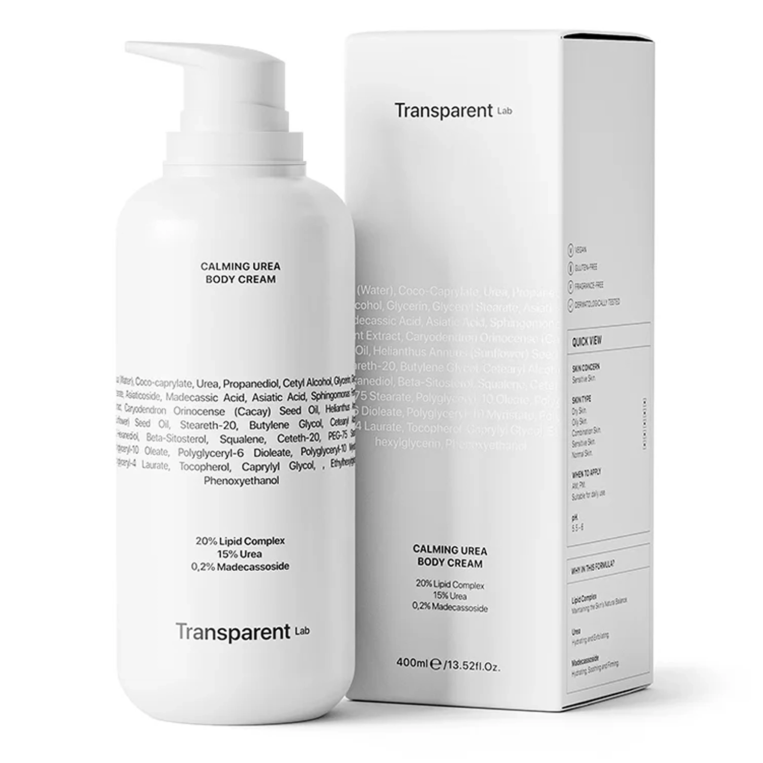 Transparent Lab - Calming Urea Body Lotion - o loțiune de corp calmantă care oferă un efect de hidratare de lungă durată. Conține uree (15%) pentru a adăuga moliciune pielii foarte uscate și aspre. În plus, ingredientele din Centella Asiatica (de exemplu, madecassoside, asiaticoside) calmează eficient iritațiile și promovează regenerarea. Squalanul utilizat netezește și hrănește pielea și îi întărește bariera hidrolipidică. Produsul lasă pielea liniștită, netedă și hidratată. Formula sa este vegană.