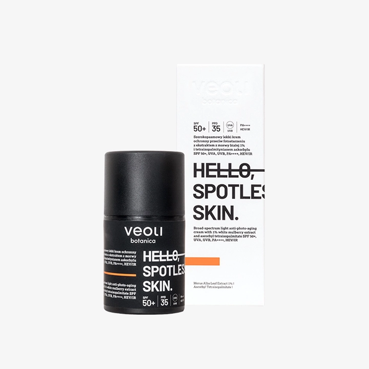 Veoli Botanica - Hello, Spotless Skin – cremă cu filtre chimice care oferă protecție solară la nivel SPF 50+ și PPD 35. Cu o textură lejeră și non-grasă, se absoarbe rapid și nu lasă urme albe pe piele. Este potrivită pentru toate tipurile de ten, în special pentru cel cu nuanță neuniformă sau pete pigmentare. Formula este îmbogățită cu vitamina C sub formă de tetraizopalmitat de ascorbil, o peptida iluminatoare și 1% extract de dud alb. Această combinație ajută eficient la estomparea petelor pigmentare și previne formarea unora noi. În plus, vitamina C și vitamina E oferă protecție antioxidantă. Datorită acestei rețete complexe, crema nu doar protejează împotriva radiațiilor solare, HEV și IR, ci și îngrijește pielea cu nuanță neuniformă, oferindu-i un aspect uniform, luminos și sănătos. Produsul are un parfum delicat, floral-oriental, este vegan, vegetarian și cruelty-free. Producătorul confirmă siguranța utilizării și în timpul sarcinii.